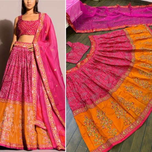 New Bollywood wardrobe team satin and taffeta silk bandhani lehenga