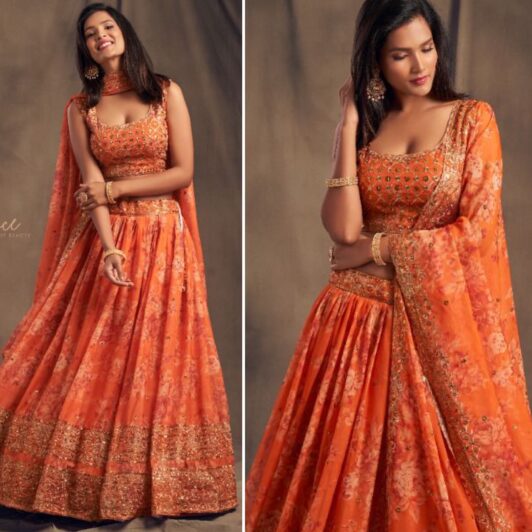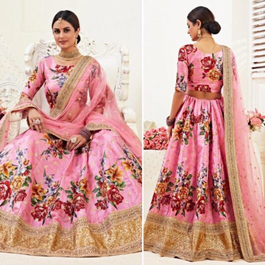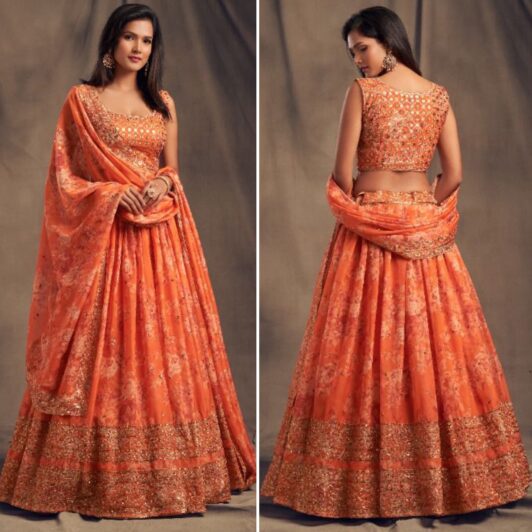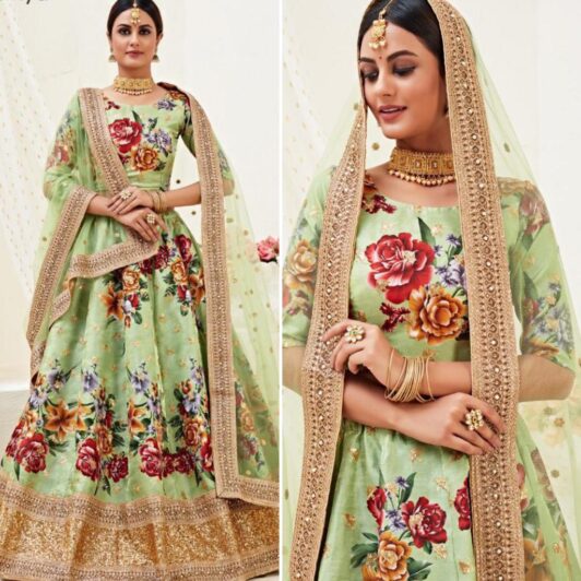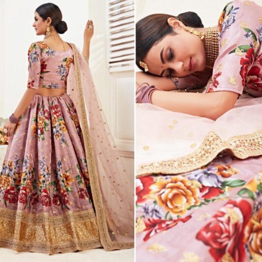 New designer floral orgnaza silk lehenga with sequin and zari embroidery work – skirt semi stitched max 42 inches waist and blouse unstitched