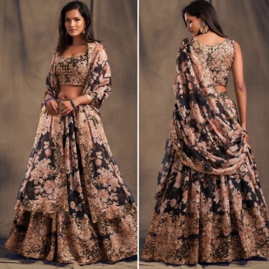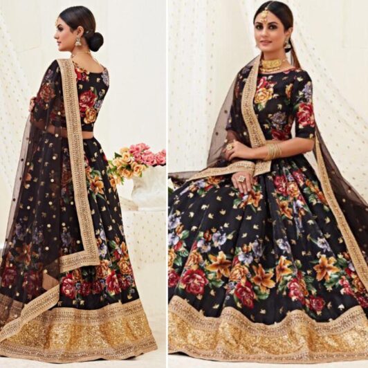 New designer black floral orgnaza silk lehenga with sequin and zari embroidery work – skirt semi stitched max 42 inches waist and blouse unstitched