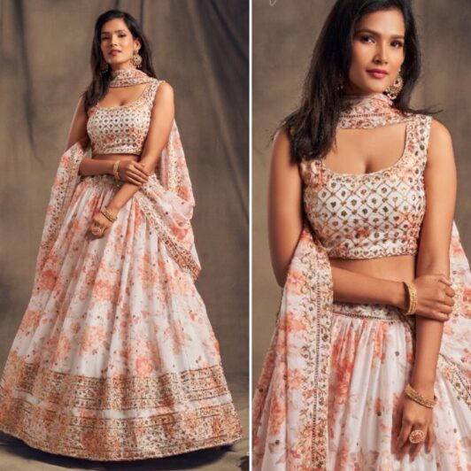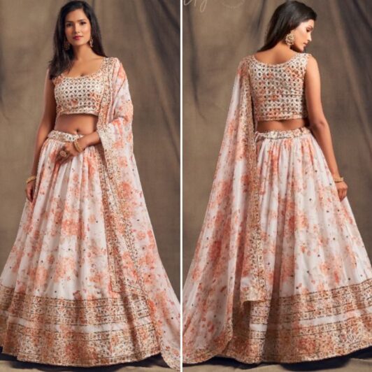 New designer off white floral orgnaza silk lehenga with sequin and zari embroidery work – skirt semi stitched max 42 inches waist and blouse unstitched