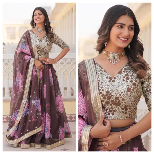 New designer Russian silk floral digital printed lehenga with sequin border and unstitched sequin blouse