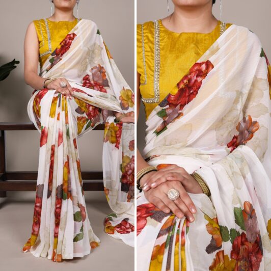 WHITE CHIFFON FLORAL SAREE PREORDER SPECIAL LNB7009WHT