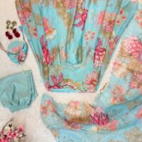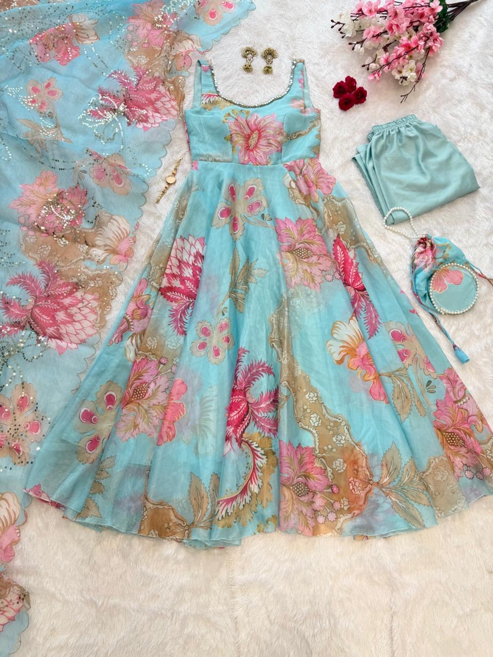 New Bollywood wardrobe team organza silk ready made floral suit with mirror work on neckline
