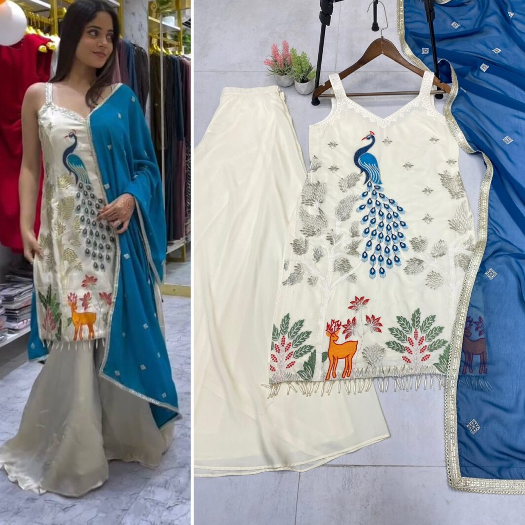 New Bollywood wardrobe team french crepe palazzo suit with peacock embroidery work