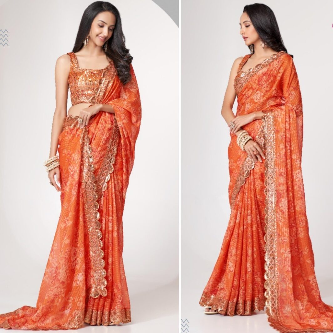 New designer digital printed organza silk floral saree with sequin embroidery work
