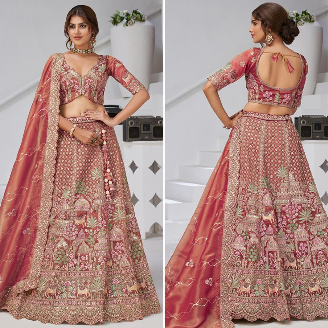 New premium range organza silk lehenga featuring exquisite paisley motifs crafted with intricate zari and resham embroidery