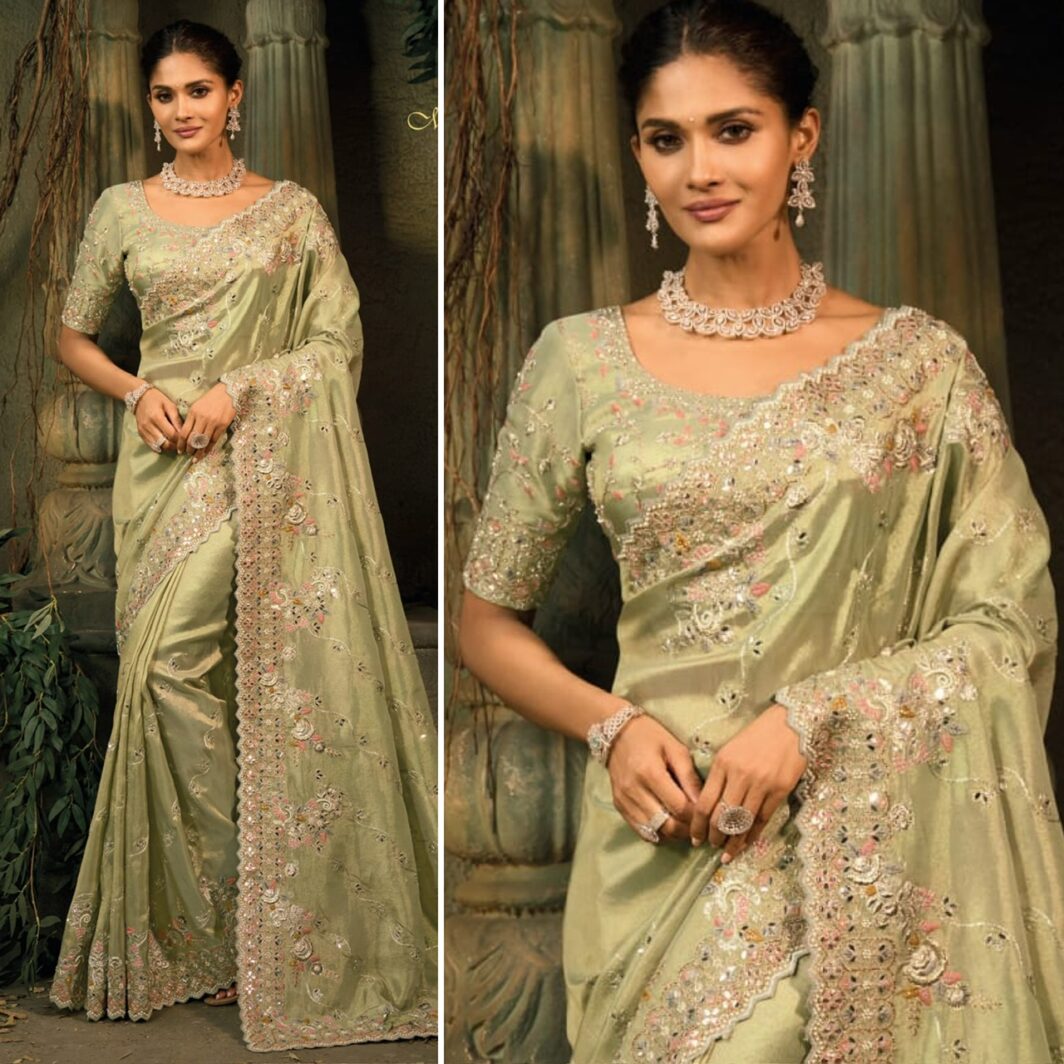 MEHANDI PURE KANJIPURAM SILK SAREE WITH CUT-DANA,MOTI & MIRROR HEAVY WORK