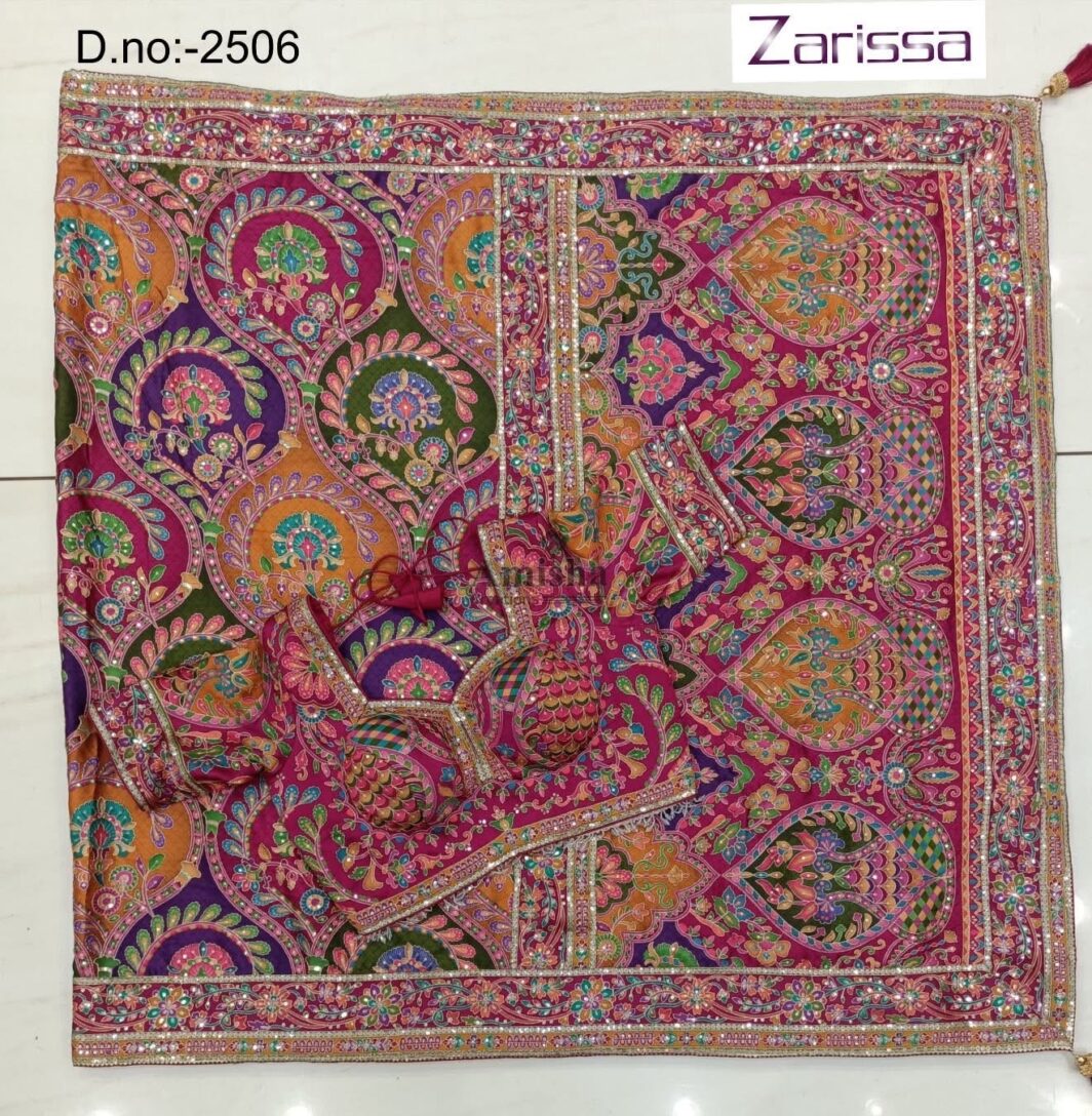 New designer position print satin silk saree with embroidery work