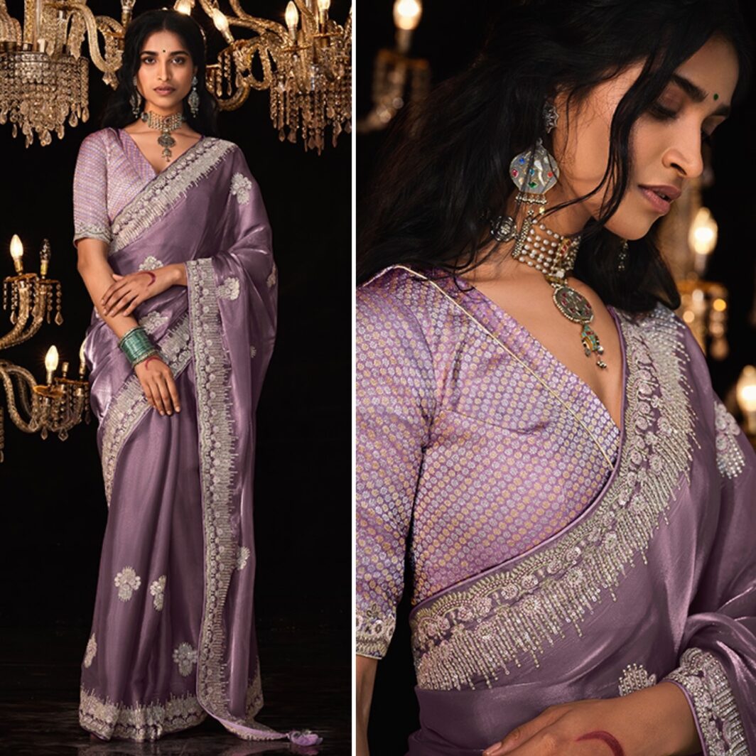 New designer glass tissue silk saree with thread and sequin embroidery work
