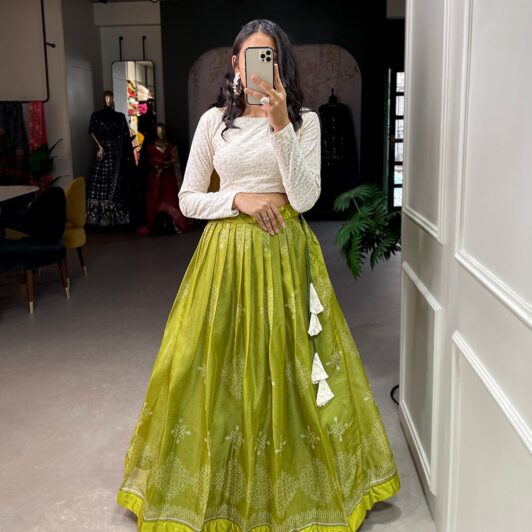 Skirt comes semi stitched max 42 inches waist and blouse unstitched