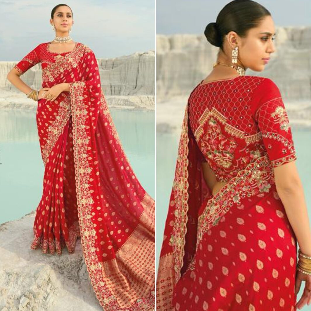 RED TO RANI PURE DOLA VISCOSE SAREE WITH JARI THREAD MOTI & CUT-DANA HEAVY WORK