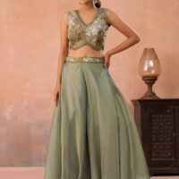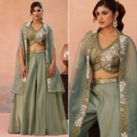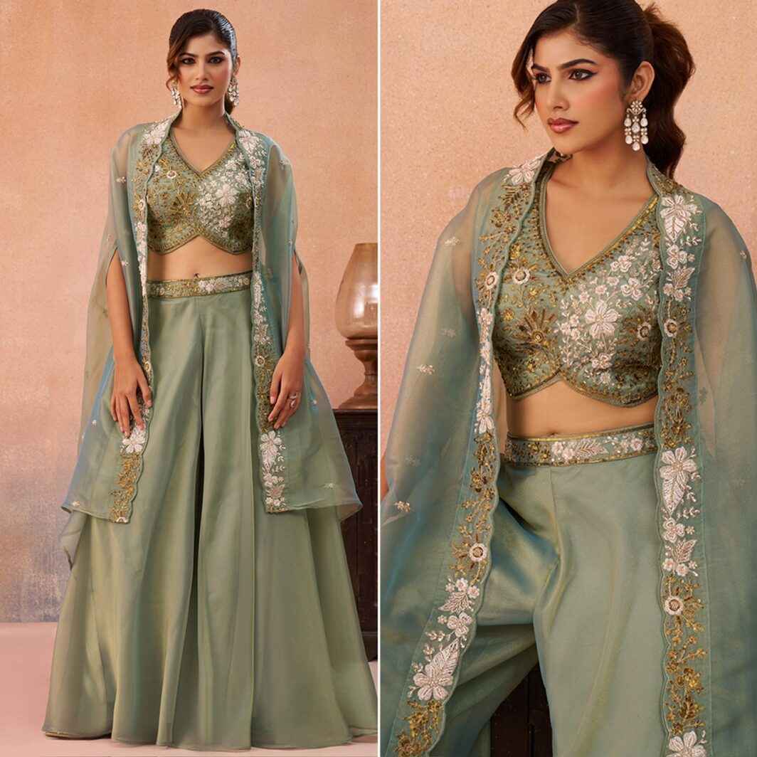 New designer ready made tissue silk co-ord set with crop top, palazzo and flared cape with beads and stones embroidery work