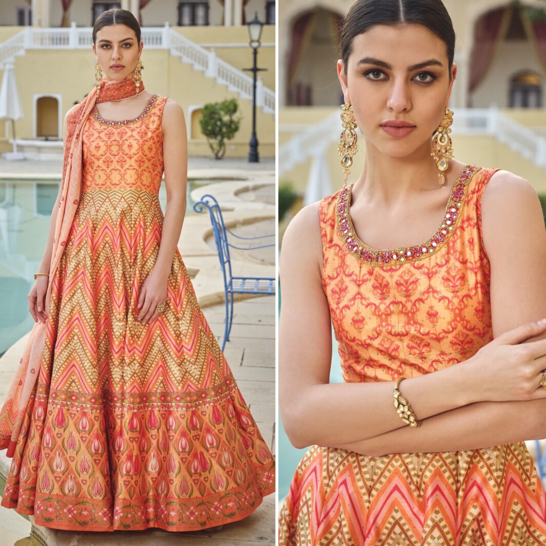 New designer ready made silk gown with digital print and neck handwork (net can can inner)