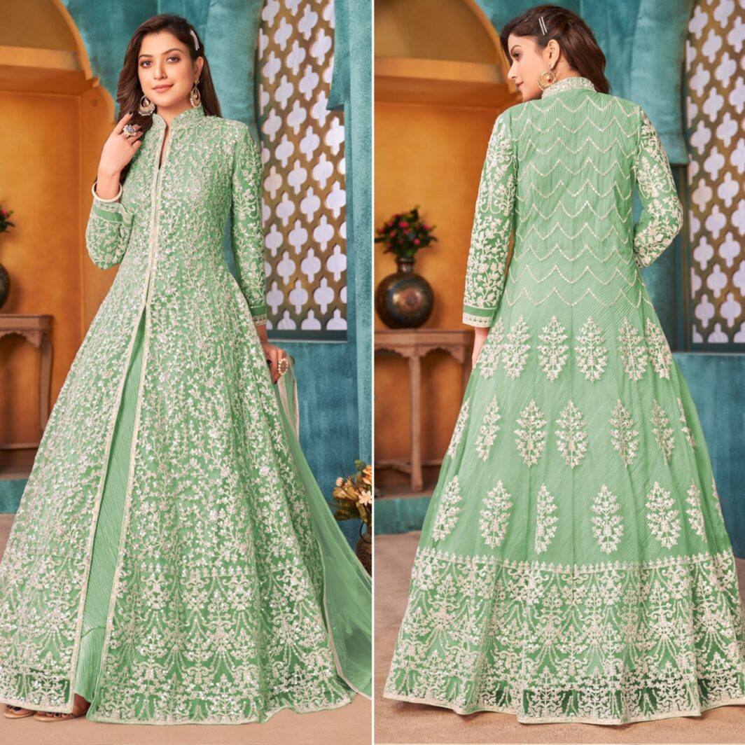 New designer soft net gown with thread and sequin embroidery work, inner crush satin