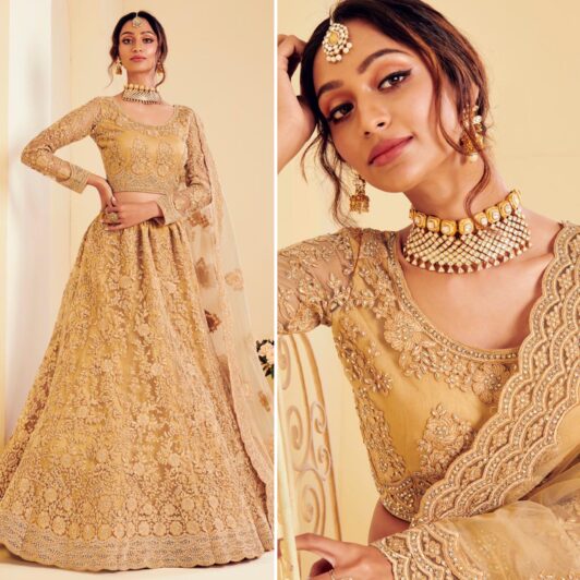 New designer soft net lehenga with stone, thread and coding embroidery work