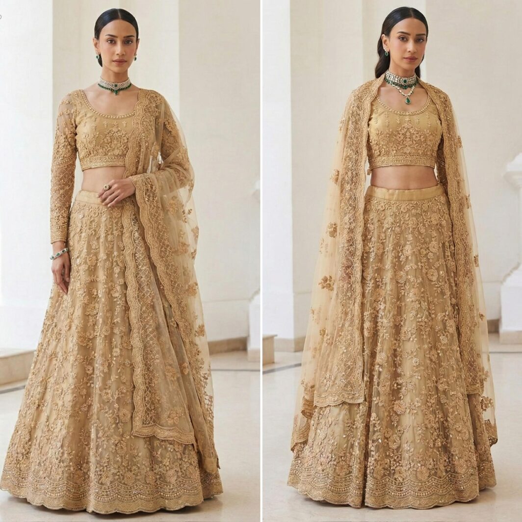 New designer soft net lehenga with stone, thread and coding embroidery work
