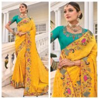 YELLOW NATURAL CRAPE SAREE WITH MOTI,CUT-DANA & 3D HEAVY WORK
