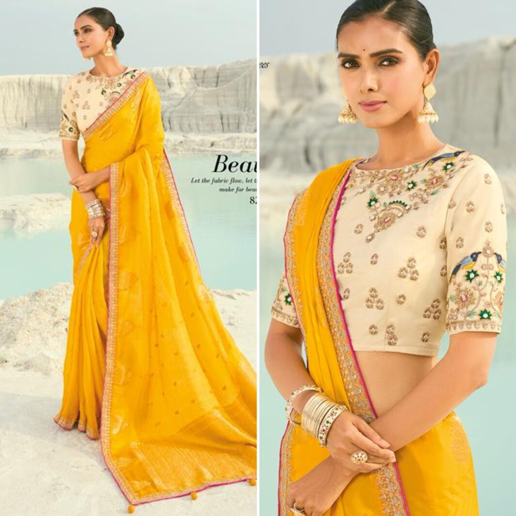 YELLOW PURE ORGENZA VISCOSE SATIN SAREE WITH CODING BORDER AND CUT-DANA MOTI