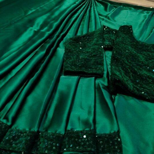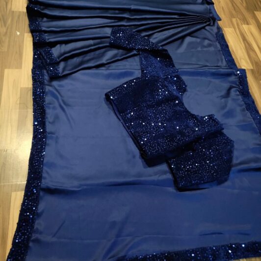 New Bollywood wardrobe team soft satin silk ready to wear saree with velvet sequin border and ready made velvet sequin blouse size 40 inches (video available on WhatsApp request)